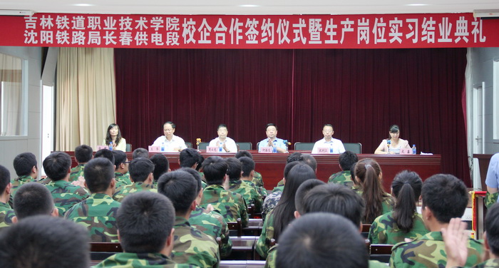 2015年8月31日,我院和沈阳铁路局长春供电段校企合作签约仪式暨2013级学生生产岗位实习结业典礼在长春供电段教育培训基地会议厅举行。与会领导有:长春供电段党委书记何振生、长春供电段副段长祝利江、教育科长武鑫,吉林铁道职业技术学院院长周云龙教授、副院长王华教授、电气工程系主任张辉教授。仪式由武鑫科长主持。