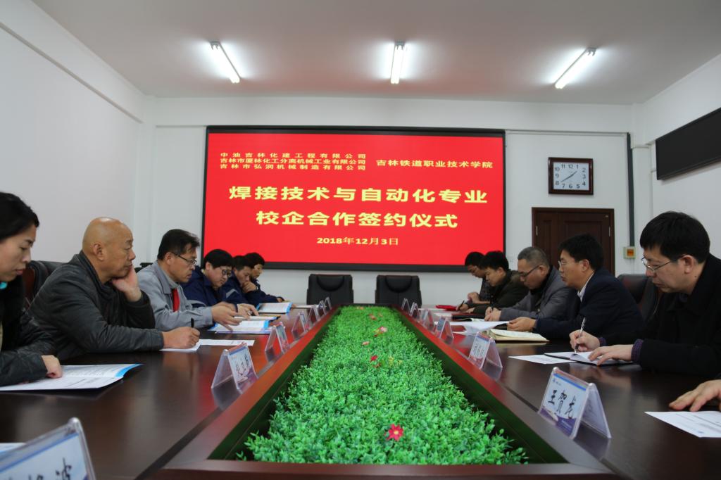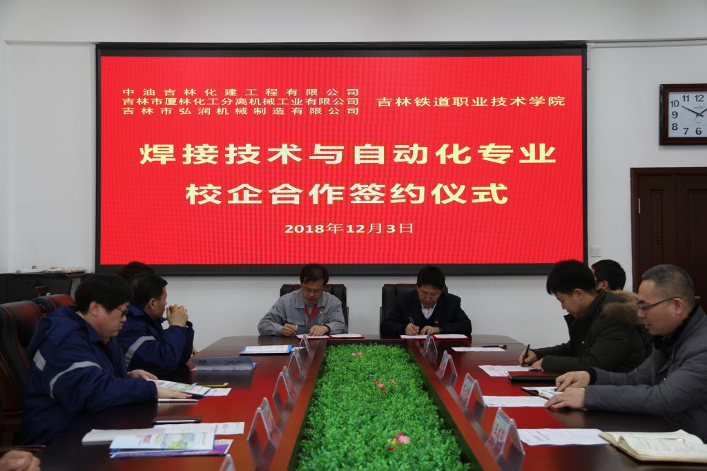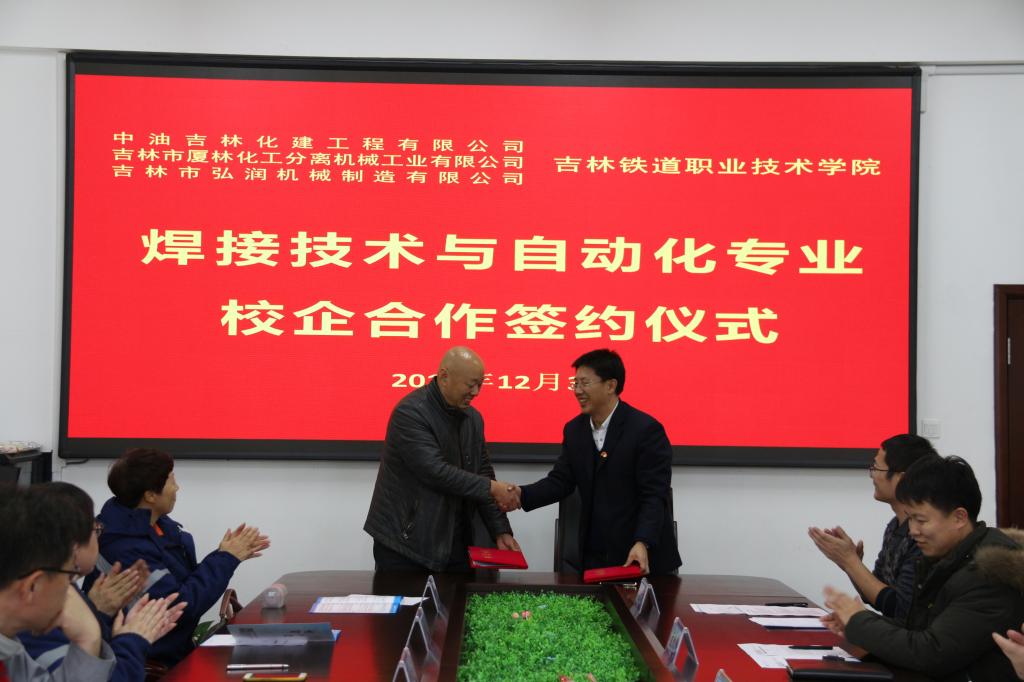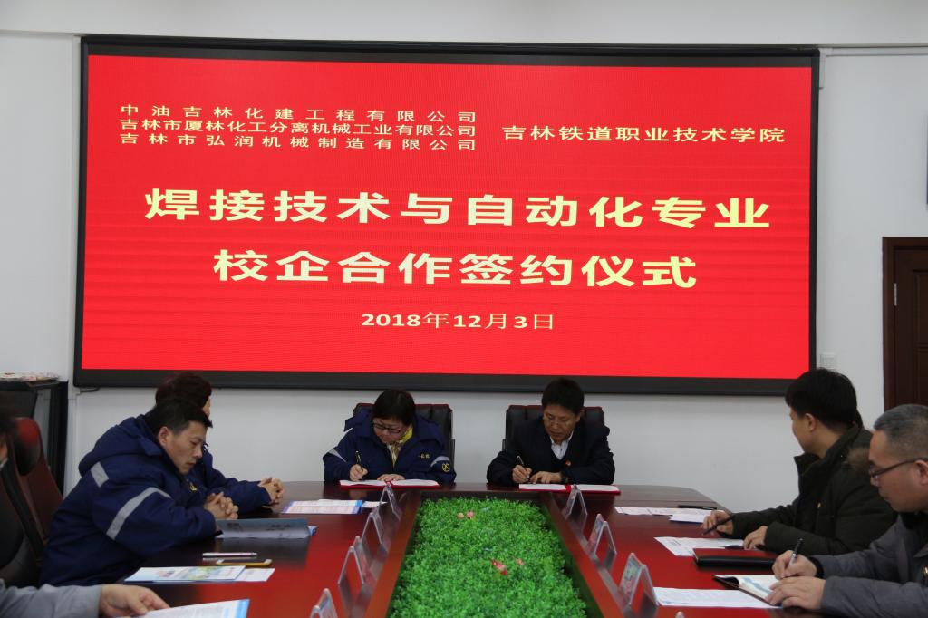 2018年12月3日下午,机械工程分理事会在办公楼第一会议室举行焊接技术与自动化专业与中油吉林化建工程有限公司、吉林市厦林化工分离机械工业有限公司和吉林市弘润机械制造有限公司校企合作签约仪式。吉林市厦林化工分离机械工业有限公司总经理王铎凝、吉林市弘润机械制造有限公司经理张明、中油吉林化建工程有限公司总经理助理崔智勇、学院校企合作处处长王建军、机械工程分院党总支书记刘锡权、分院院长孙志刚、焊接自动化教研室主任王贺龙等参加了本次仪式。签约仪式由机械工程分院副院长董大伟主持。